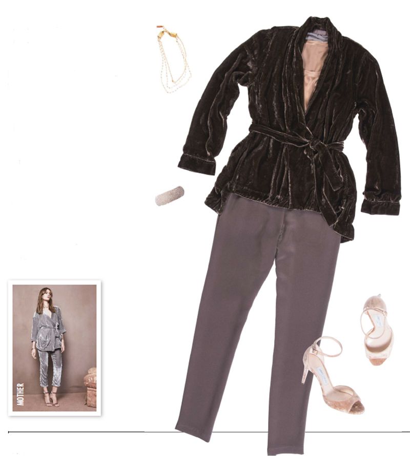 Mother capitalized on the cozy glamour of velvet with a silver ensemble topped by an enveloping wrap coat. Our version still shines, but we tempered the trendiness with a pant style sure to last