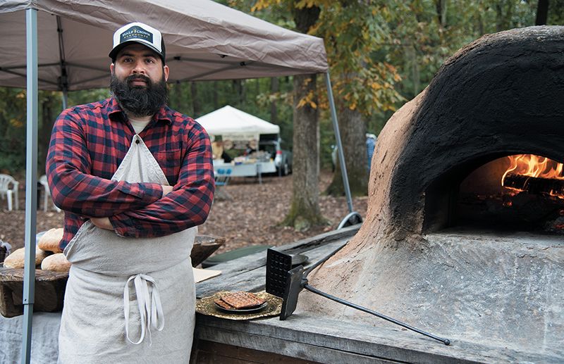 Justin Cherry of Half Crown Bakehouse built a period-correct 18th-century clay oven to make dishes, such as rice waffles with his 270-year-old waffle iron.