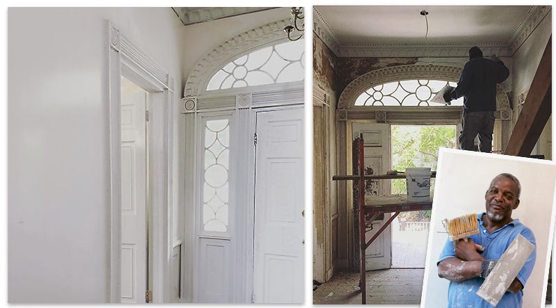 “It was torn up real bad,” remembers Jenkins, who found the walls and ceiling of the James Macbeth House (c. 1846) in tatters. Because of the home’s unique Greek Revival architecture, the building crew had to run the ductwork across the wall inside a hallway, then frame around it. “I had to plaster the ductwork so it wouldn’t show,” says Jenkins. “Even as I put on the scratch coat, brown coat, and the white coat, I didn’t know what the outcome would be.” But if you look at the hallway today, you’d never know the duct system was there. The humble artisan says it’s all in a day’s work: “I’ve been doing this so long, it just comes natural.”