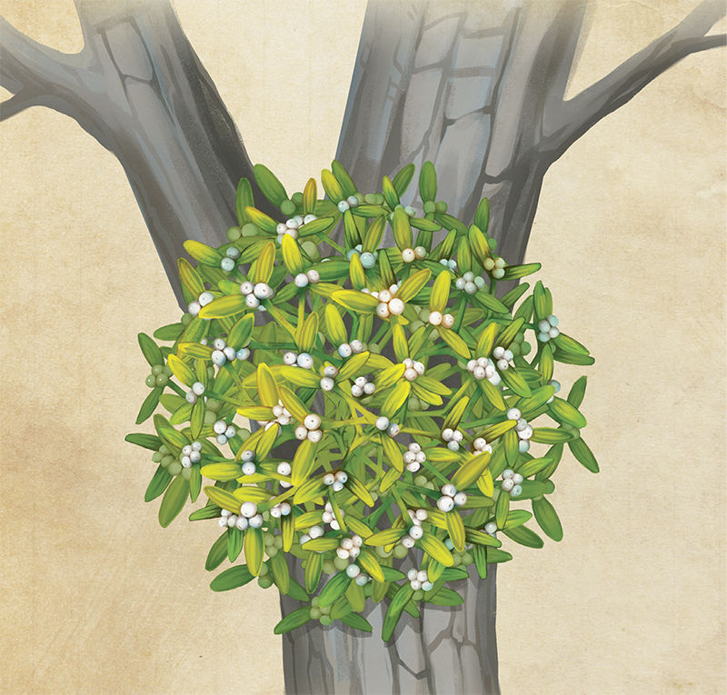STRANGE NAME - “Mistletoe” is a blending of two Anglo-Saxon words: “mistle” for dung (in this case, bird droppings) and “toe” for twig. After eating the plant’s berries, birds either regurgitate or excrete the seeds in droppings. The seeds are coated with a gooey substance called viscin, which sticks firmly to a tree branch and hardens, providing a solid base for a new plant to germinate and grow.