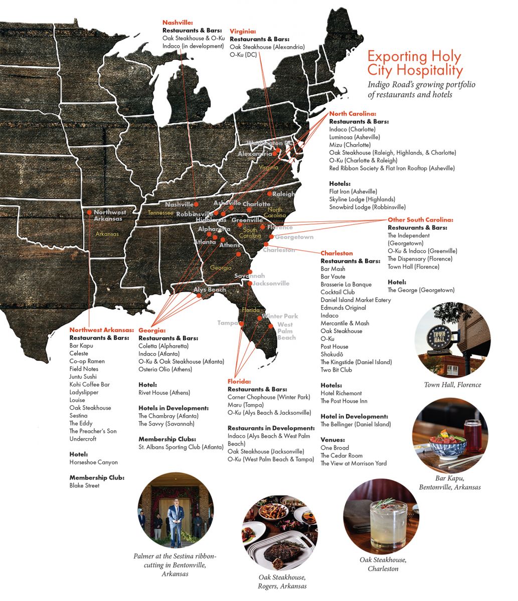 A lot of things have been going right for Indigo Road, too. In 16 years, the group has grown from a single Charleston steak house to 40 restaurants in seven states. And with a dozen more in the works, Palmer and his team show no signs of slowing down.
