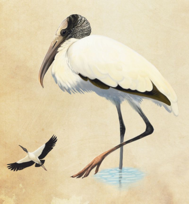 Standing some three feet tall with a five-foot wingspan, an adult wood stork is the largest wading bird native to America. Its body is all white except for black flight feathers at the tips of its wings, while its most distinctive feature, a bare head and neck slate grey in color, inspired the common name “flinthead.”