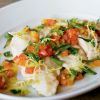 Stanhope features his heirlooms in the tomato vierge, making them into a straightforward, room-temperature sauce that is a perfect foil for the warm, meaty grouper. He gives them star billing in his chilled heirloom tomato and watermelon terrine, which he describes as “elegant and classic.” Then he puts his vine ripes to the heat, roasting them with olive oil, garlic, and herbs to top his grilled piadina.