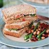 Sandwich: Veal meat loaf with red pepper spread and fresh spinach on multigrain bread