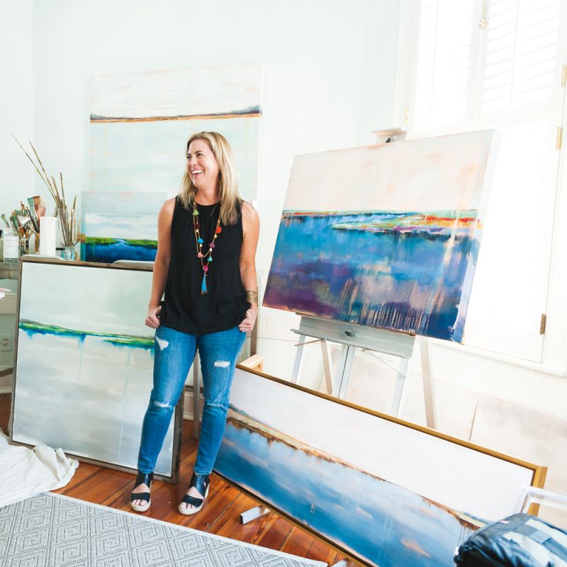 Growing up, Shannon Brown Wood spent countless hours exploring the Lowcountry’s marsh grasses and tidal creeks with her siblings. Today, she strives to recapture that innocent, emotional connection she had with the land in her paintings. Working out of her home studio along the banks of Charleston Harbor in Mount Pleasant’s Old Village (just one house down from her childhood abode), Wood evokes nature’s light and energy with thick brushstrokes, a vivid color palette, and actual remnants of nature, including reeds she sews into her canvases. Her paintings are sold at the Grocery restaurant (where they adorn the walls), through the home and lifestyle retailer Serena and Lily, and online at Charleston Artist Collective and shannonwoodart.com.