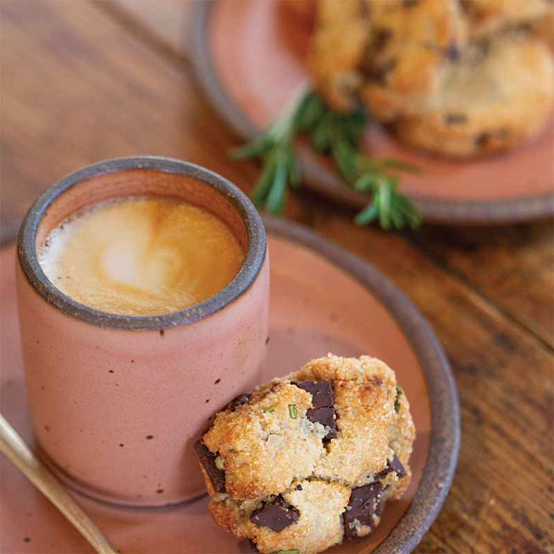 Combine the flour, baking soda, salt, and rosemary, and mix well. Stir in the coconut oil, maple syrup, orange juice, and vanilla and mix until a dough forms. Fold in the chocolate chips. Use two tablespoons of dough to form two-ounce dough balls and place onto the prepared sheet. Press down gently, and sprinkle the tops with coconut sugar. Bake for 10 minutes, until golden brown. Let cool completely on pan before removing.