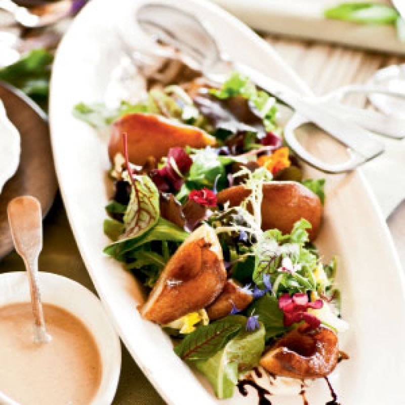 Wash lettuces in cold water and drain in a colander. Dry with paper towels and refrigerate. Toss lettuces with vinaigrette and season with salt and pepper. Spoon goat cheese on the platter. Top with dressed greens and warm pears. Drizzle with the reduced vinegar. Pecan Vinaigrette Heat a large sauté pan over high heat. Add pecans and stir until almost burnt. Place pecans and vinegar into a blender, and blend on high speed. Add honey and season with salt to taste. Slowly drizzle in oil. Whipped Goat Cheese In a standing mixer, whip the cream with whisk attachment. When soft peaks start to form, crumble in goat cheese. Whip for one minute. Season with salt to taste. Balsamic Roasted Pears Peel and halve pears. Using a melon baller, remove seeds. Season with sugar and salt. Heat a sauté pan over high heat. Add oil. When hot, add pears cut-side down. Turn heat down to medium. Allow pears to caramelize, about five minutes. When pears are dark brown, add vinegar. Turn over and cook until fork tender, about five minutes, occasionally basting them with vinegar. Remove pears and leave at room temperature. Simmer remaining vinegar until it is reduced to a glaze. Reserve.