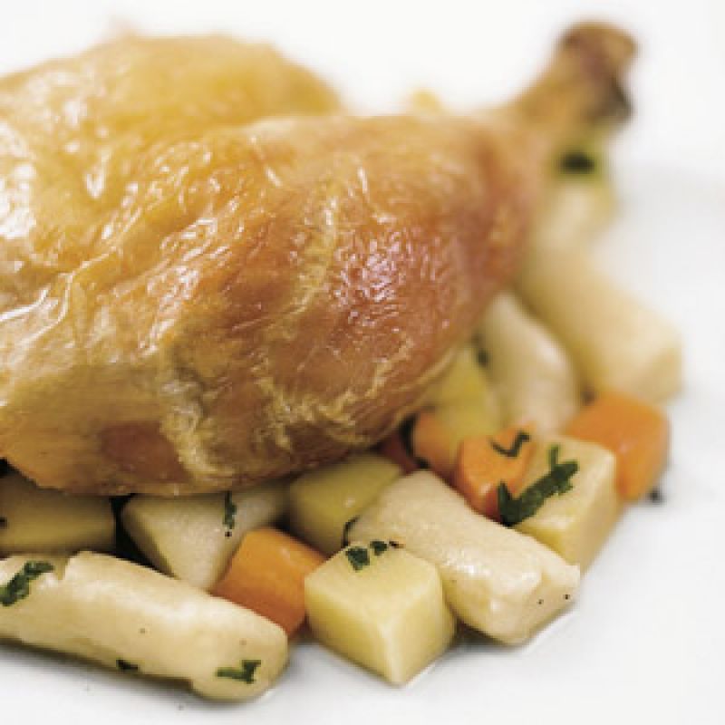 For the Chicken: Place first eight ingredients in a pot large enough to hold the chicken and bring to a boil, stirring until salt and sugar dissolve. Remove from stove and let brine come to room temperature. Add chicken and refrigerate for eight to 12 hours. Remove chicken from brine, pat dry, and place on baking sheet with sides. Refrigerate uncovered for four hours. Preheat oven to 350°F. Place chicken on bed of onions, celery, and carrots and roast, basting occasionally, for 75 to 90 minutes, or until juices run clear when thigh is pierced. (You can make stock from the vegetables.) For the Jus: Take juices and drippings created from roasting chicken, skim off and discard any fat, and place in a heavy-bottomed saucepan. Add wine and chicken stock and bring to a simmer. Simmer until thick enough to very lightly coat a spoon. Season with salt and pepper. Just before serving, whisk in butter. For the Root Vegetables: Preheat oven to 350°F. Peel and cut vegetables into half-inch by half-inch dice. Place in a bowl, toss with olive oil, and sprinkle with salt and pepper. Place vegetables on heavy baking sheet with sides and roast for 45 minutes, or until soft. Add more salt and pepper to taste. For the Potato Gnocchi: Preheat oven to 400°F. Pierce potatoes several times with a knife, wrap in foil, and bake for one hour, or until they are soft. Remove from oven and let cool enough to handle. Peel off skin and put potatoes through a ricer into bowl of a stand mixer. Add salt and egg yolk. Sift flour into bowl. Using paddle attachment, mix on low until a ball is formed. Let dough rest for five minutes. Using a lightly floured surface and hands, roll dough into ropes approximately half an inch thick. Cut ropes into one-inch gnocchi. If using immediately, to serve two, boil half of gnocchi in heavily salted water for two to three minutes, or until they float. Drain well and toss with butter, root vegetables, and a quarter-cup of chicken jus. To make ahead, after cutting gnocchi, place on a floured baking sheet and freeze. Once frozen, place gnocchi in a freezer bag and boil them when needed, adding an additional minute to cooking time. Gnocchi can keep in freezer for up to a month.