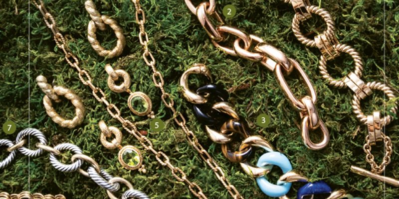 Statement-making jewelry goes high-end with chunky gold links, sparkling gems, and earthy motifs