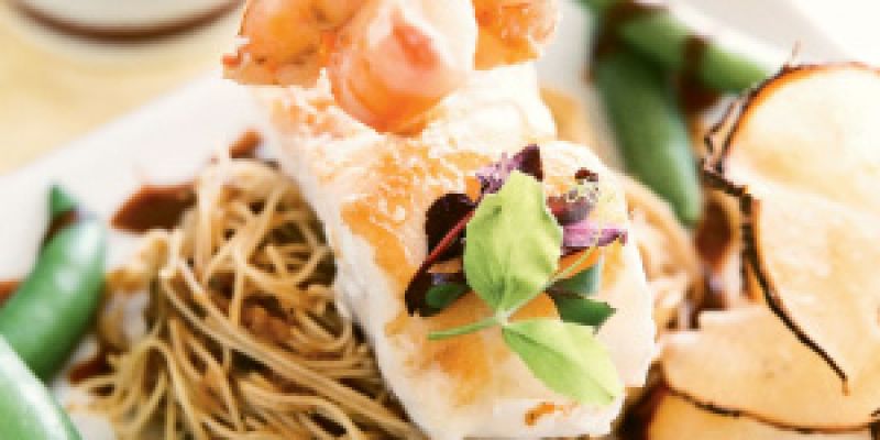 Pan-Seared Black Sea Bass with Local Shrimp & Sugar Snap Peas