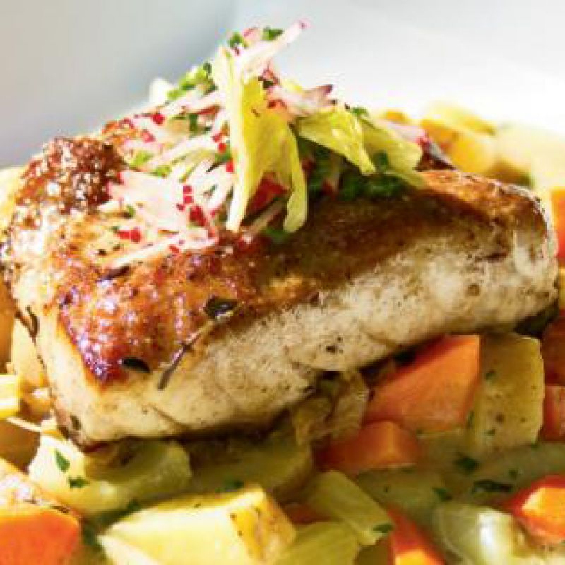 Divide the vegetables and chowder among six bowls. Place the fish filets on top of the chowder. Place garnish on top of the fish and serve.