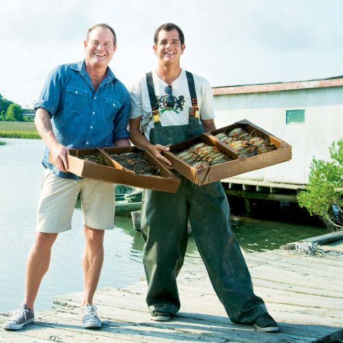 Pick a peck: Larson (left) with Pete Ambrose of Ambrose Family Farm, where the chef sources his local peppers. Kept covered in the refrigerator, fresh bell peppers should hold for a week.