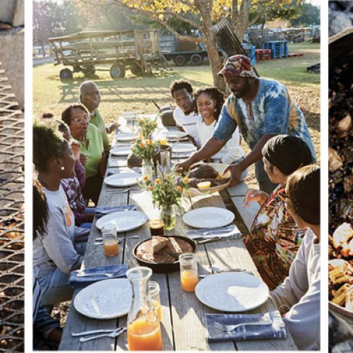 Okra, collards, and shrimp develop a subtle smoky flavor while being cooked over coals.