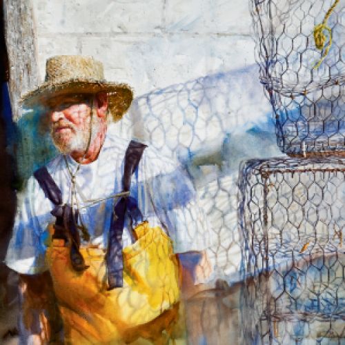 A painting by local artist Lulie Wallace hangs in the den.