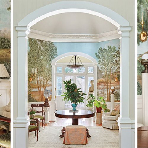 SCene Stealer: The 18-foot ceilings in an octagonal room at the center of this circa-1877 Summerville house rise to a dramatic skylight dome replete with an original plaster crown. The high rosette window brings the only natural light into the room, so designer Alaina Michelle Ralph created a “view” using a scenic Iksel wallpaper and lightened the room by extending the “sky” with Benjamin Moore’s “Woodlawn Blue” paint. The mural depicts an idyllic Italian countryside scene evoking the home’s Italianate architectural style.