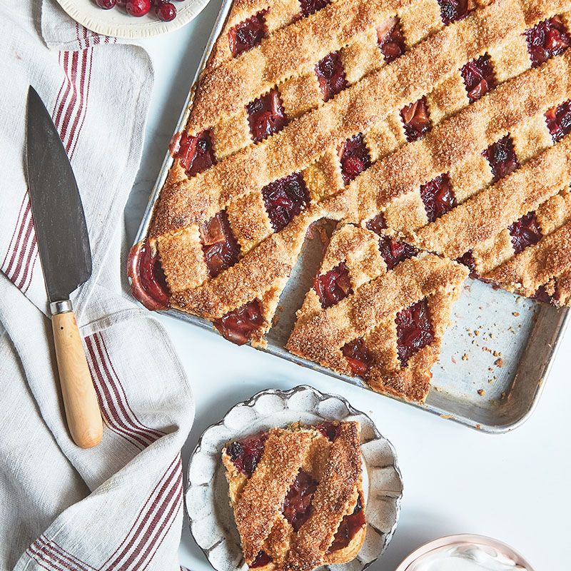 After chilling, roll each disk of dough in between two large sheets of parchment paper to a rectangle slightly larger than the baking pan, about 19 by 15 inches. Lay one rectangle, still in between the sheets of parchment paper, on top of a baking sheet and refrigerate it. This will be used to make the lattice top.