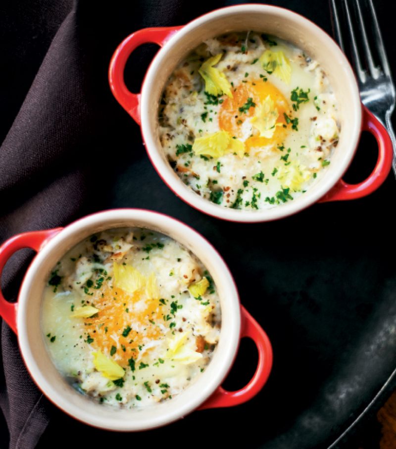 Baked Eggs with Smoke Mackerel, Celery, & Whole-Grain Mustard