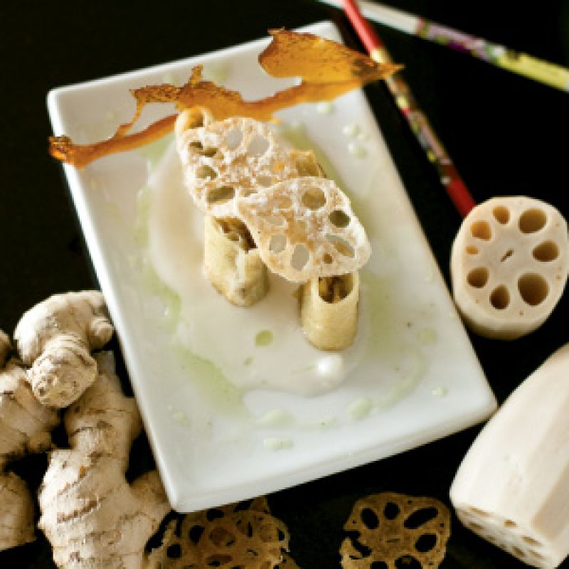 Lay wonton wrappers out next to each other on work surface. Spread a small spoonful of filling along top fourth of each wrapper. In a small bowl, whisk egg for one minute. Use pastry brush to apply a bit of egg around edges of each wrapper. Roll wrapper over filling and keep loosely rolling to the end, sealing edges. In small pot, heat oil to 375°F. Fry lotus root slices until crisp. Remove and sprinkle with powdered sugar. Set aside. Gently place filled wrappers in same hot oil. Cook until golden and crispy, about three minutes. Remove, pat dry, and slice into bite-size pieces. Arrange spring rolls on serving plate. Drizzle mint syrup around edge of plate, then garnish with spun sugar. Serve with coconut sauce. Banana Filling Cook bananas, butter, and sugar in sauté pan over medium heat until sugar begins to caramelize. Move pan off burner, then add vanilla and rum. Replace pan on stove, taking care to stand back, as rum will ignite and produce small flame until alcohol cooks out. Remove pan from heat and allow bananas to cool, then use two forks to crush them into a paste. Mint Syrup 2 cups sugar 2 cups water 1 packed cup mint leaves Combine sugar and water in a saucepan and simmer until reduced by half. Remove from heat, add mint leaves, and steep for two hours. Strain and refrigerate. Spun Sugar 1 cup sugar Place sugar in small pan over medium heat, stirring until it forms a liquid, roughly 20 minutes. (Using a wooden spoon tends to break down the sugar faster.) Once liquid, drizzle over parchment paper, making any designs you wish. Allow to harden, which happens almost instantly, then set aside. (Be sure not to touch the sugar, as it reaches 365°F and will badly burn you.) Coconut Cream Sauce 1 cup Coco Lopez 2 Tbs. chopped lemongrass Put Coco Lopez and lemongrass in a saucepan, bring to a simmer, and remove from heat. Allow lemongrass to steep for two hours. Strain and keep at room temperature.