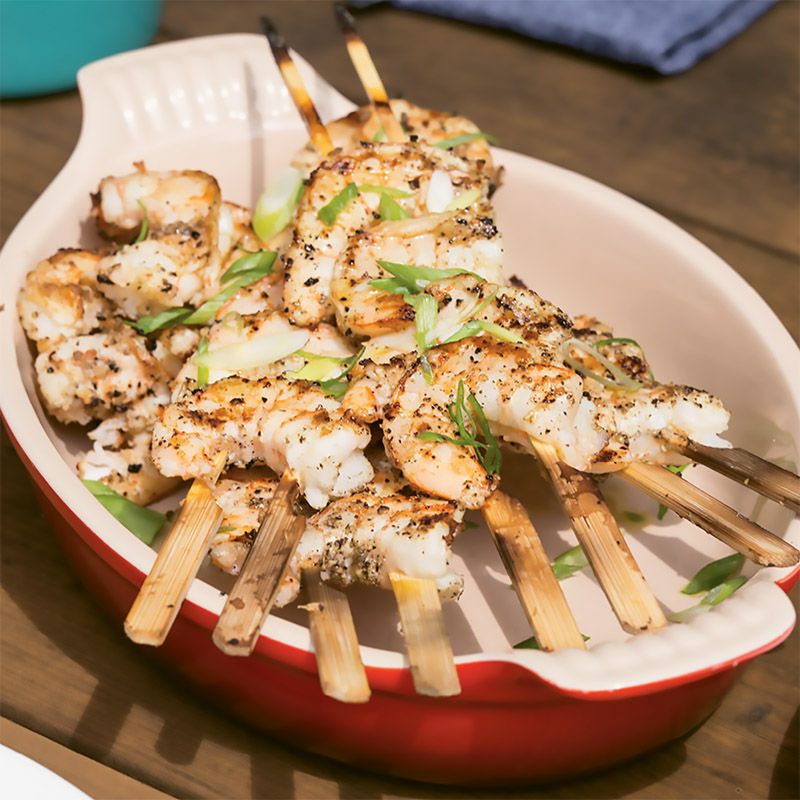Combine the pepper, cardamom, garlic, ginger, lime zest, and lime juice. Add the shrimp and toss. Place six to eight shrimp on a skewer (depending on size), leaving just a small space in between the shrimp to help them cook evenly. Drizzle the olive oil on the shrimp and sprinkle with salt.