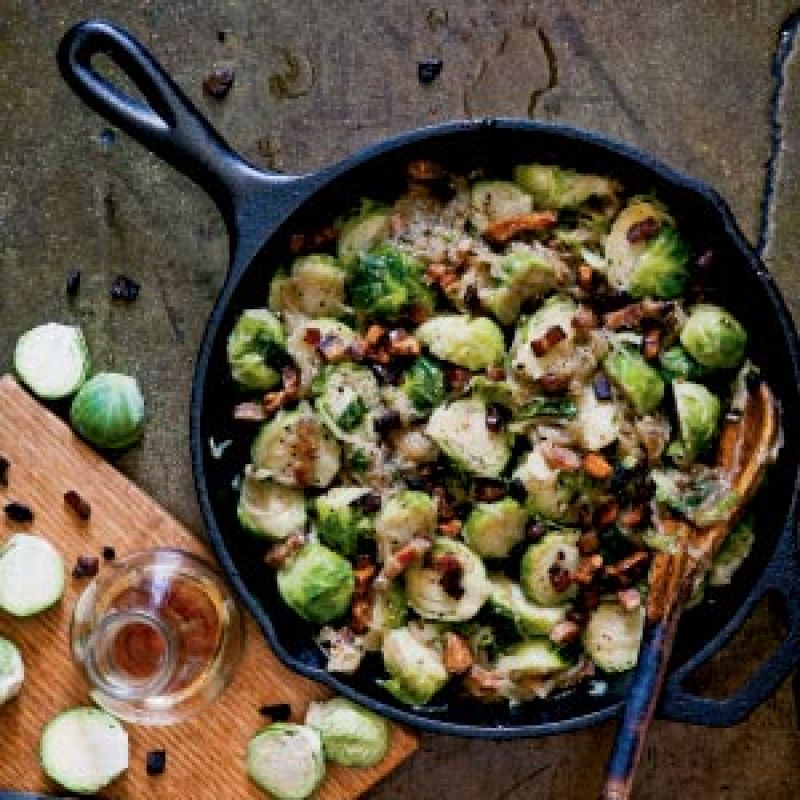 Stir in Brussels sprouts and heat. Add remaining tablespoon of butter and stir to incorporate. Season to taste with salt and pepper. Serve.