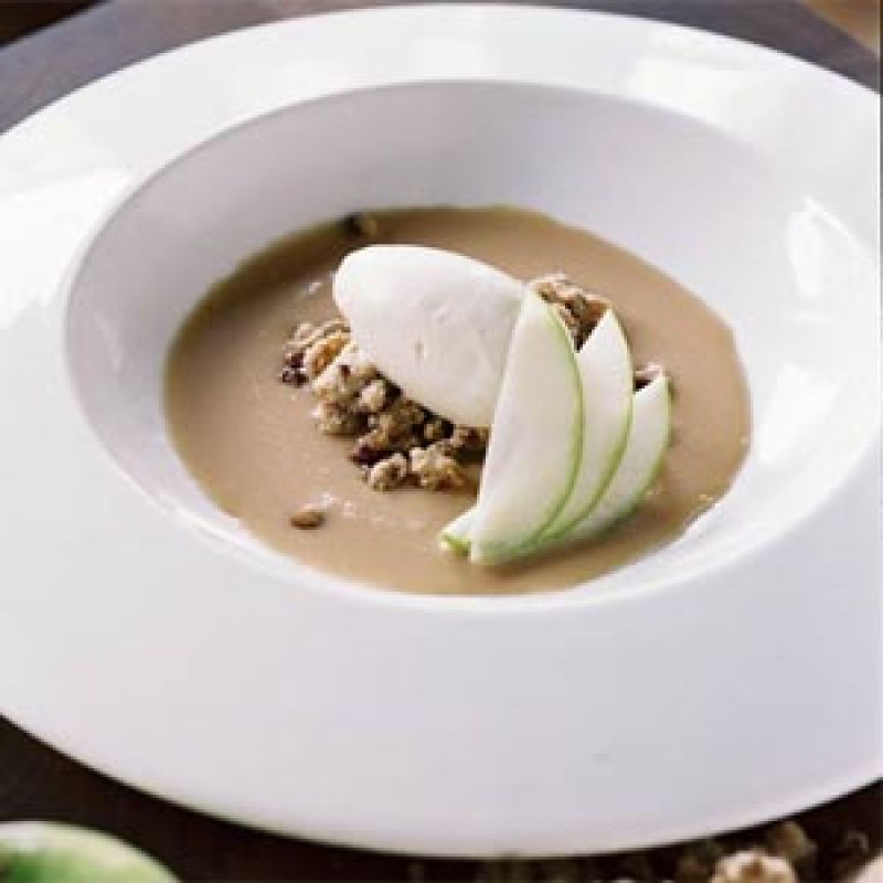 Place about two tablespoons of Pecan Streusel in each of six serving dishes. Place a scoop of French Vanilla Bean Ice Cream on top of streusel. Garnish with apple slices. Soup can be poured table-side or at the last minute before presenting.