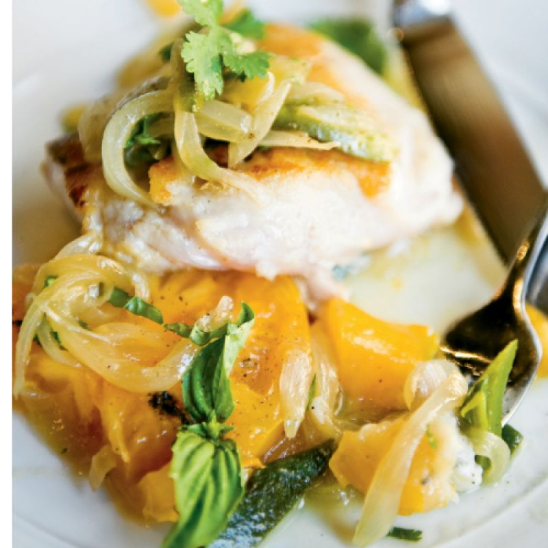 When ready to serve the sauce, bruise the herbs with a mortar and pestle. Add the herbs, lemon and lime juices, and olive oil to the caramelized onion mixture. Serve immediately over red drum or tile fish.