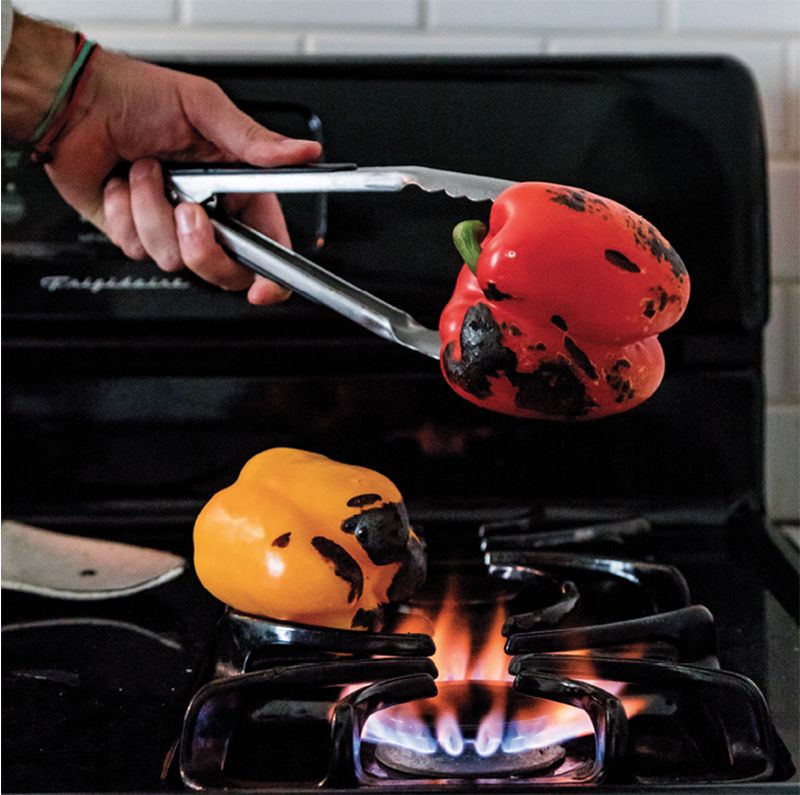 Roast the peppers whole over an open flame on a gas-stove top, rotating them constantly, until blackened. Transfer them into a glass bowl, cover it with plastic wrap, and set aside. When the peppers have cooled to room temperature, peel off the skin and remove the seeds. Tear into quarters and place on a serving plate.
