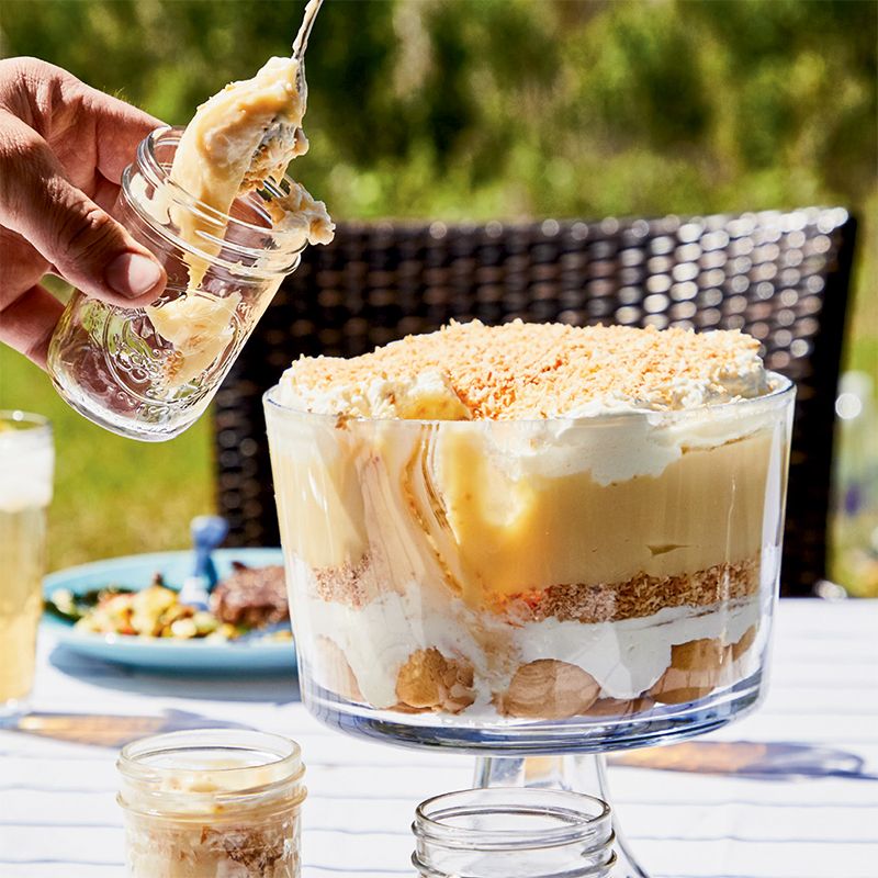 Make a layer of vanilla wafers on the bottom of a footed trifle dish, top with 1/2 cup of the toasted coconut, and set aside.