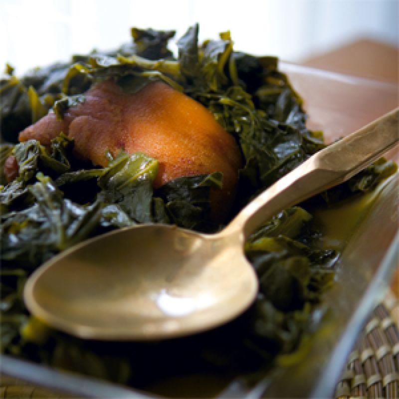 Rinse ham hocks. Place in large pot with water, cover, and bring to a boil. Reduce heat and simmer for two and a half hours, or until ham hocks are tender. Cool. Remove meat from bones and place back into cooking pot, discarding any fat and unnecessary parts. Place collard greens in a sink filled with cold water and sprinkle with salt to wash out the sand. Wash again with salt and a third time without salt. Cut leaves off stalks and into thirds. Remove ham hocks from pot. Place collards in pot with ham hock liquid. Sprinkle with sugar. Top greens with ham hock meat. Cover and cook for one hour, or until tender. Add crushed pepper flakes for the final 10 minutes of cooking.