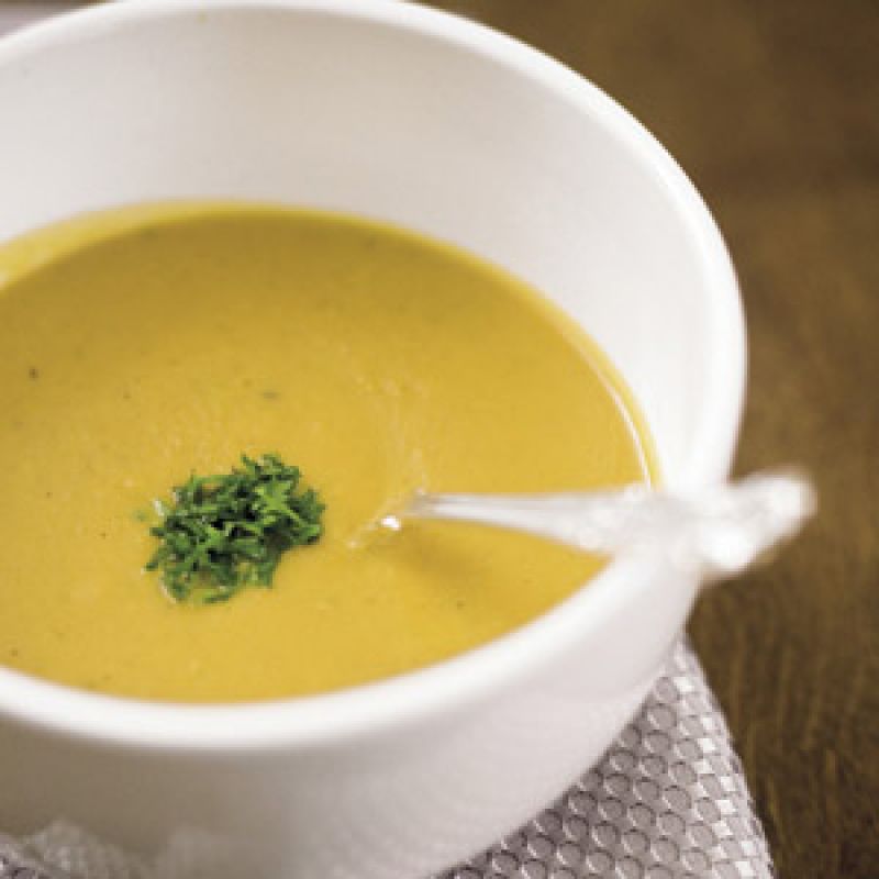 Heat oil in a heavy-bottomed pot. Add onion and celery and cook on low, stirring occasionally, until tender and translucent, about 20 minutes. Add garlic, potatoes, curry, thyme, and bay leaf, and stir to combine. Increase heat to medium-high. Stir in wine and stock, and bring to a boil. Reduce heat to low and simmer, stirring frequently, for 35 to 45 minutes, or until potatoes are soft. Remove bay leaf. Add coconut milk and purée with an immersion blender or in batches in a blender. Strain soup through a fine sieve. Season to taste with salt and pepper. Garnish with parsley.