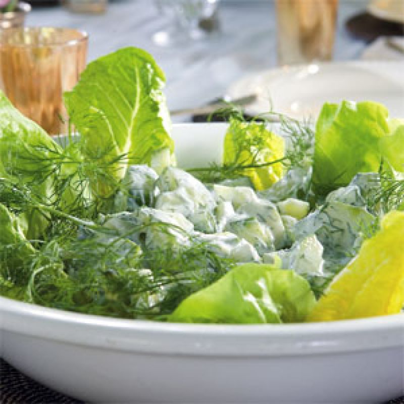 Cut the cucumbers in half lengthwise. With a spoon, scoop out the seeds and discard them. Slice the cucumber halves crosswise in 1/8-inch pieces. Place in a colander set over a bowl. Toss with salt. Let stand 15 minutes.