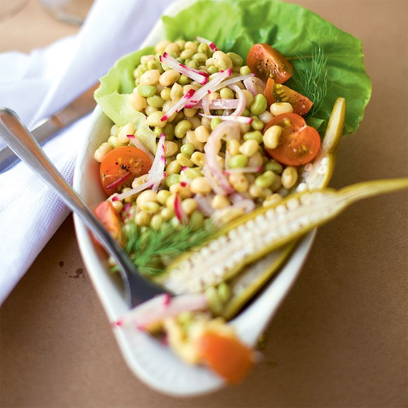 Put the peas, vinaigrette, dill, and hot sauce in a medium bowl and stir gently until thoroughly combined. Season with salt and pepper to taste. Stir to combine and transfer to plates or serving dish. Garnish with tomatoes and radishes.