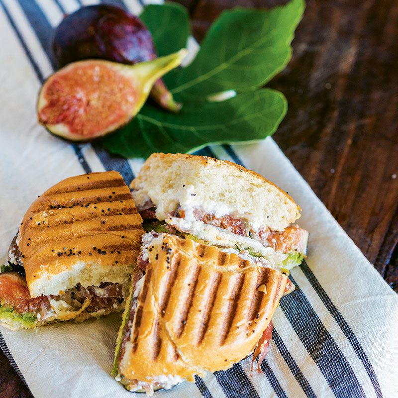 Lather one interior side of the rolls with the pesto and the other side with the ricotta salata. Completely cover the ricotta side with the fig slices. Place two ounces of prosciutto over each pesto side. Put both sides together and brush both sides of the roll with olive oil. Place in the panini press and cook for five to seven minutes or until browned.