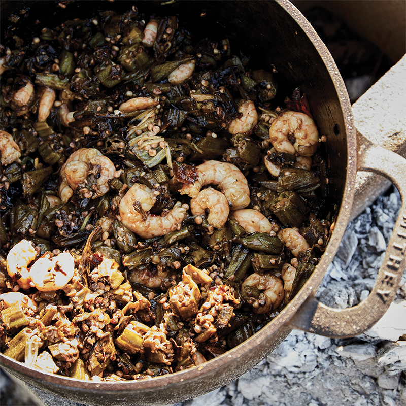 Place a 10-inch cast-iron skillet over medium heat and add just enough oil to coat the bottom. Add okra and cook until it begins to brown, stirring occasionally. (If okra starts to stick, add more oil.) Stir in the next 5 ingredients and cook for 5 to 8 minutes until shrimp is ready. Add more salt and pepper to taste before serving.