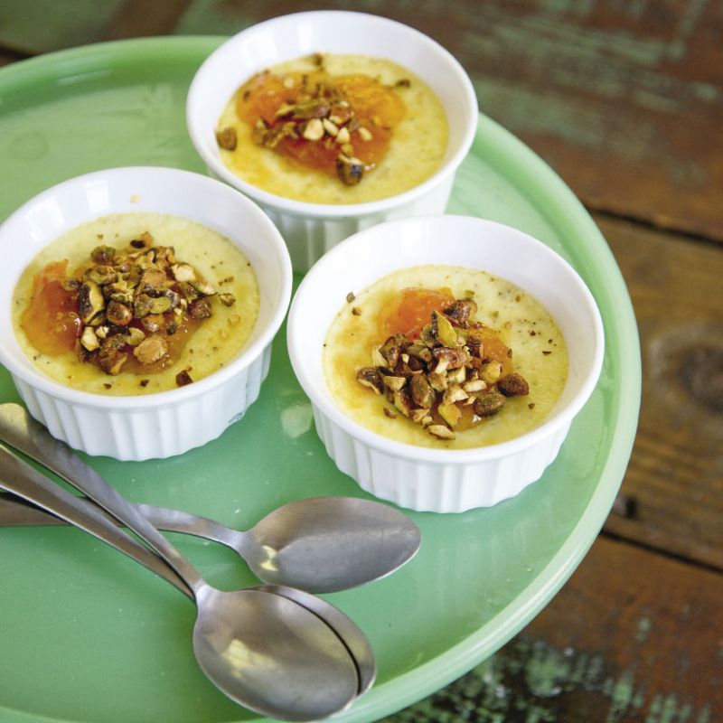 Bake the budinos for 30 minutes, checking the doneness by gently nudging one of the ramekins. If the center still seems liquid, rotate the pan 90 degrees and continue baking until the entire budino has a uniform jiggle. This could take anywhere from five to 15 additional minutes. Remove the ramekins from the baking dish and set aside until cool enough to handle. Top each with a teaspoon of apricot jam and the coarsely chopped spiced pistachios and serve immediately. You can refrigerate the budinos for later use but, before serving, let them come to room temperature for about 30 minutes and then reheat for seven to 10 minutes at 350°F and top with apricot jam and spiced pistachios.