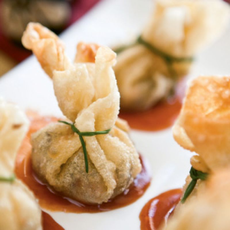In a sauté pan, sear flank steak in canola oil for three minutes, then remove from heat. Lay on paper towels to dry and cool. Blanch chives briefly in boiling water, then immediately immerse in cold water, dry, and set aside. In medium bowl, mix steak, Sambal Oelek, goat cheese, spring onions, and water chestnuts until well-blended. Lay all but one wonton wrapper out next to each other on work surface. Place a spoonful of steak mixture into center of each wrapper. Bring opposing corners of wonton square together and pinch to form a “purse.” Tie shut using a blanched chive. In a small, deep saucepan, heat vegetable oil to 350°F. Fry purses three or four at a time until golden brown and hot through, approximately two minutes. Sprinkle with salt. Cut reserved wonton wrapper into thin strips. Fry the same way for additional garnish. Spread plum sauce underneath purses for flavor. Serve warm or at room temperature.