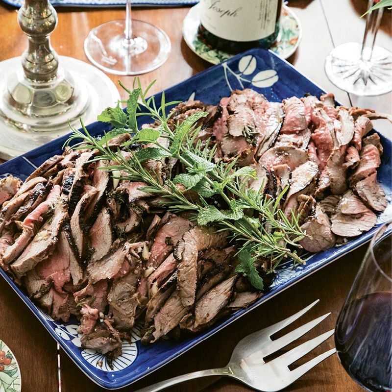 Prepare a hot grill (350-450°F on a gas grill). Bring the lamb to room temperature. Remove the meat from the marinade, drain it well, and pat it dry. Pour the remaining marinade into a small bowl and set aside. Grill the lamb for 10 to 12 minutes, or until well charred, basting it with the reserved marinade. Turn it over and grill the other side for another 10 to 12 minutes, again basting with marinade. The internal temperature should be 150°F for medium-rare. Remove it from the grill and let it rest for about 15 minutes. Carve it into 1/4-inch slices and serve. The lamb will keep for two days in the refrigerator.