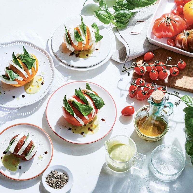 Core the tomatoes. Cut a thin slice off the core end of each tomato so that it will sit flat. Using a sharp knife, cut five slices about 1/3-inch thick across each tomato. Cut deeply but not all the way to the bottom. Set aside.