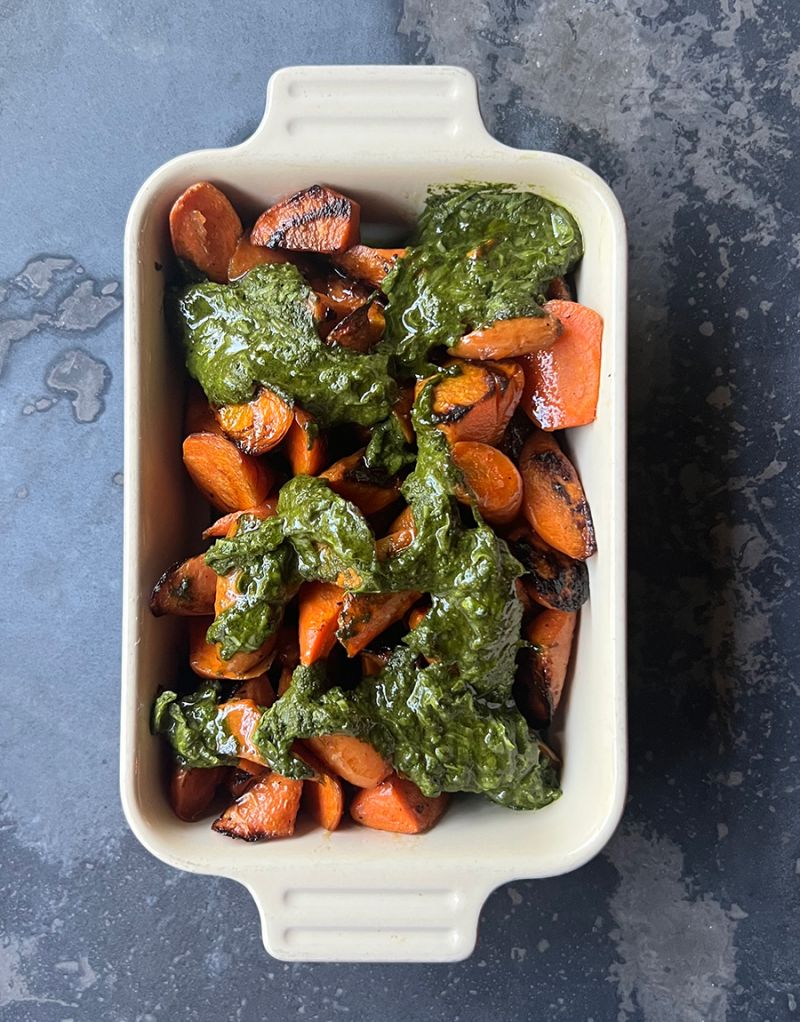 In a large bowl, toss carrots with olive oil and salt, and pepper to taste. Place the carrots on a large sheet tray and roast until tender, about 20 minutes. Spoon them into a serving dish and top with the sage pesto.