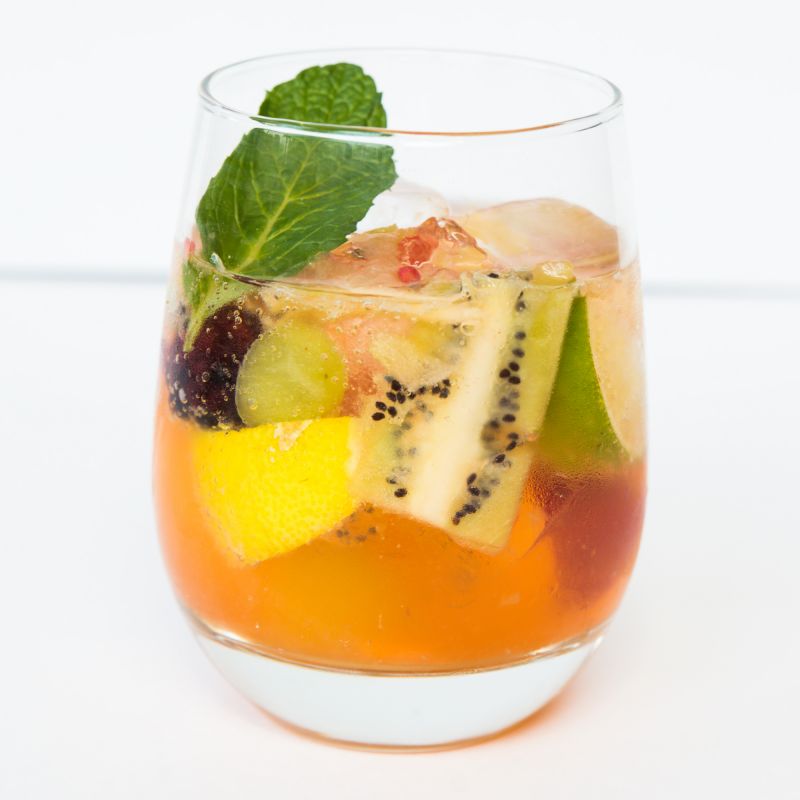 Squeeze two lemon, two lime, and two orange wedges into a pitcher. (You can toss in the rinds for more color.) Add the rum, lemongrass-ginger syrup, and macerated fruit. Stir. Add ice to fill the container, then top with sparkling wine. Stir gently and serve over ice in a glass with mint.
