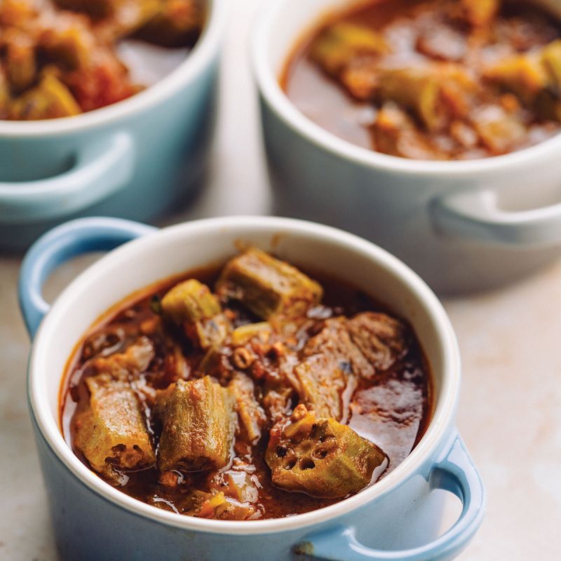 Heat the oil in a large Dutch oven or other heavy pot over medium heat. Add the beef and cook, stirring, until well-browned on all sides. (You may need to cook the beef in batches to get it nice and brown.) Remove the beef from the pot and set it aside. Stir in the onion, reduce the heat to medium-low, and cook for a few minutes, until the onion picks up some color from the browned bits in the pot. Stir in the broth and tomatoes, season with salt and pepper, and bring to a boil. Stir in the okra, adjust the heat to a simmer, and cook for 45 minutes.