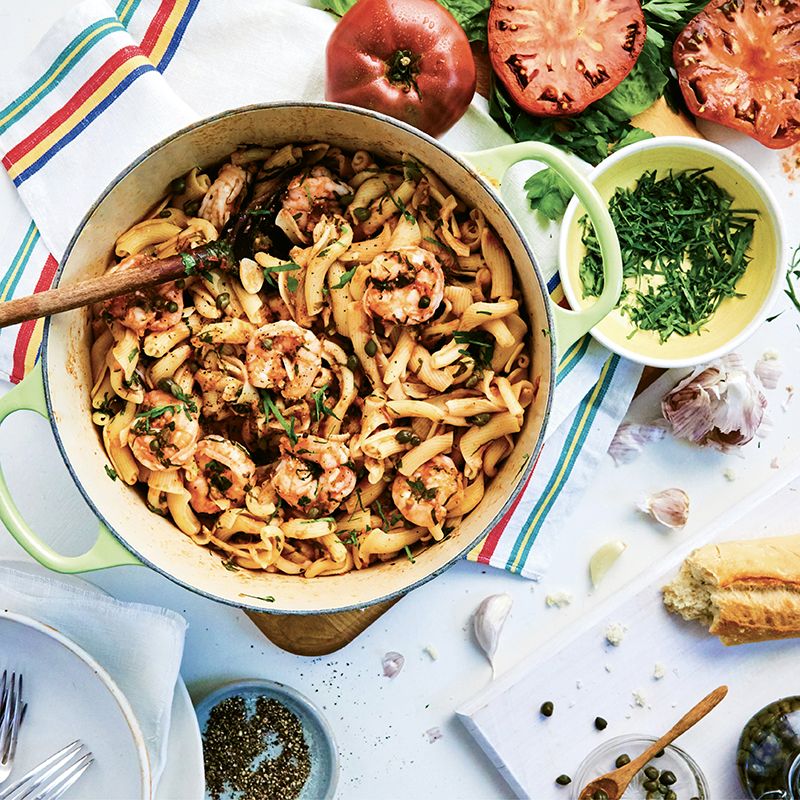 Bring the sauce to a boil, reduce the heat to medium, and simmer for 10 minutes. Add the shrimp and cook for two to three minutes, or until pink. Add the campanelle to the simmering sauce and cook for one minute. Stir in the parsley and basil and serve.