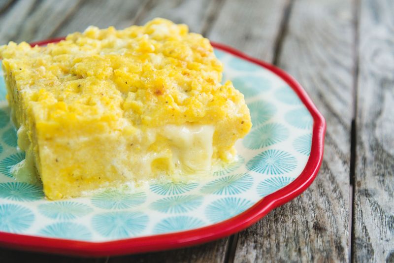 Brush a nine-inch by nine-inch baking dish with olive oil. Dump half of the cornmeal in and spread it out evenly. Layer the sliced cheese on top. Spread the remaining half of the cornmeal over it.