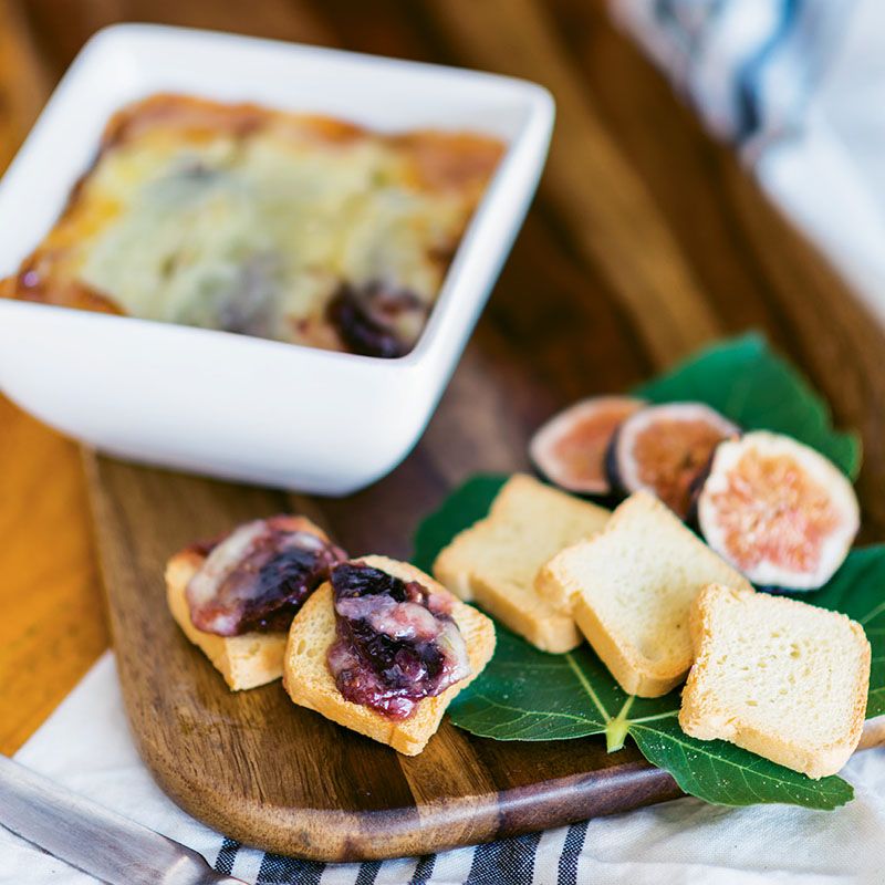 Divide the fig mixture between two four-inch-wide by 1/2-inch-deep ramekins. Cut the white rind off of the Brie. Cut it into 1/4-inch-thick slices and divide them between the two dishes, placing them on top of the fig mixture. Place the dishes on a rimmed baking sheet and bake for eight to 10 minutes, or until the Brie is melted and bubbling. Serve hot with crostini or your favorite cracker.
