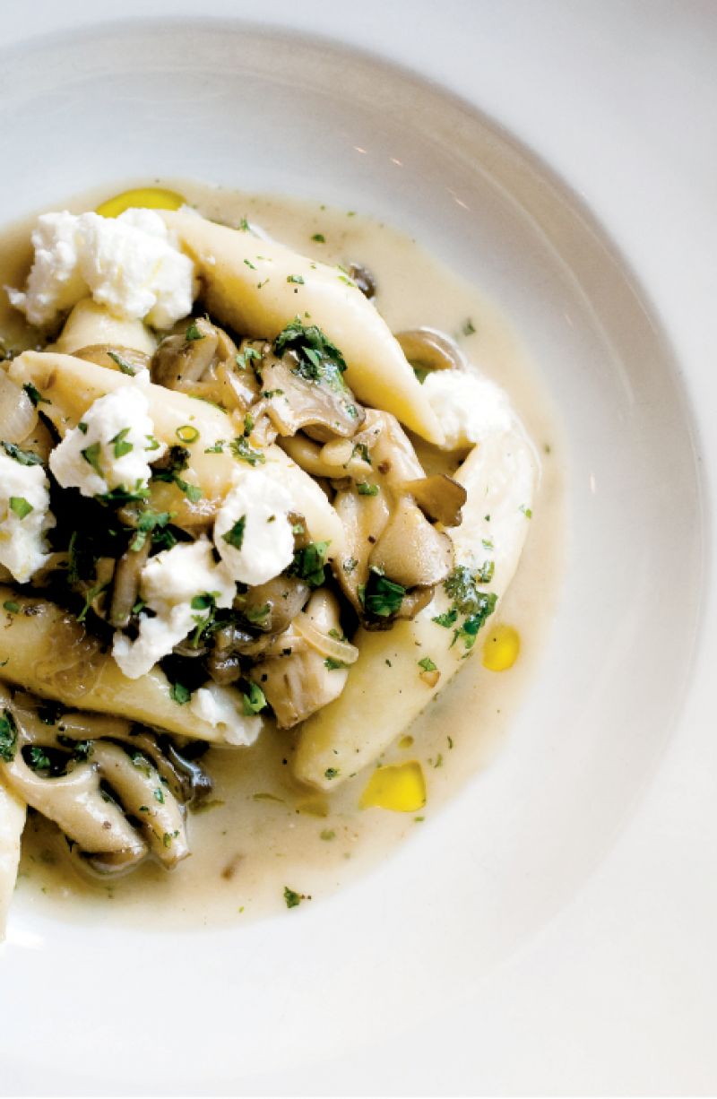 Heat canola oil in a large frying pan over medium heat. Add shallots and cook, stirring occasionally, for about three minutes. Increase heat to medium-high and add mushrooms. Sauté them, stirring occasionally, for five minutes, or until they are tender. Add chicken stock and cook until reduced by half, about three minutes. Add butter, goat cheese, and herbs. Season with salt and pepper to taste. Add the cooked gnudi, stir until heated all the way through, and serve immediately.