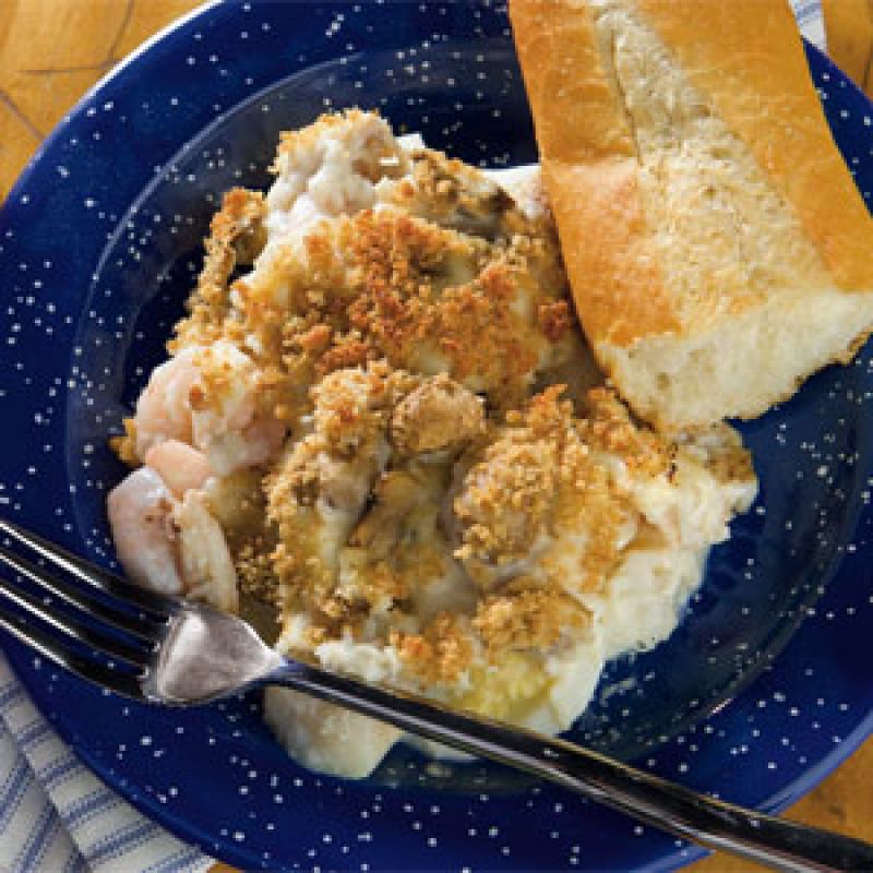 Preheat oven to 350ºF. Lightly grease a 9 x 13'' casserole dish. Arrange scallops, shrimp, and crabmeat in a layer along the bottom of the dish. Heat three tablespoons of the butter in a medium skillet. Add mushrooms and sauté for three minutes. Spoon into casserole dish and top with a layer of cheese. In a small saucepan, melt four tablespoons butter over low heat. Add flour and salt and simmer for one minute. Gradually add milk and stir until thickened. Pour into casserole dish and sprinkle bread crumbs over top. Bake 25 minutes. Note: Can be assembled before baking one day in advance.