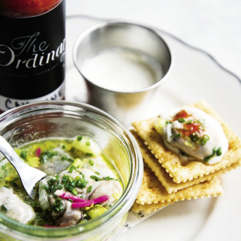 Remove the oysters and shuck into a bowl. Add the celery, shallots, chives, lemon juice, and olive oil and mix gently. Serve with the saltines, crème fraîche, and hot sauce.