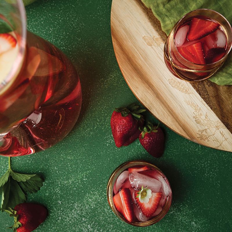In a two-quart container, combine the cooled syrup with the orange juice and rosé and stir in raspberries, the remaining strawberries, and apple slices. Chill for at least an hour for the flavors to meld. When ready to serve, combine with soda water in a large pitcher. Serve over ice