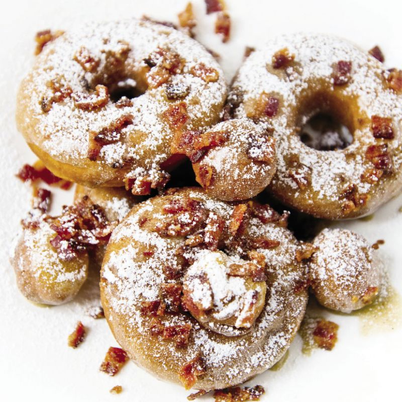 About a minute after the doughnuts have come out of the fryer, dip their top side in the glaze and sprinkle with candied bacon. Serve while still warm.