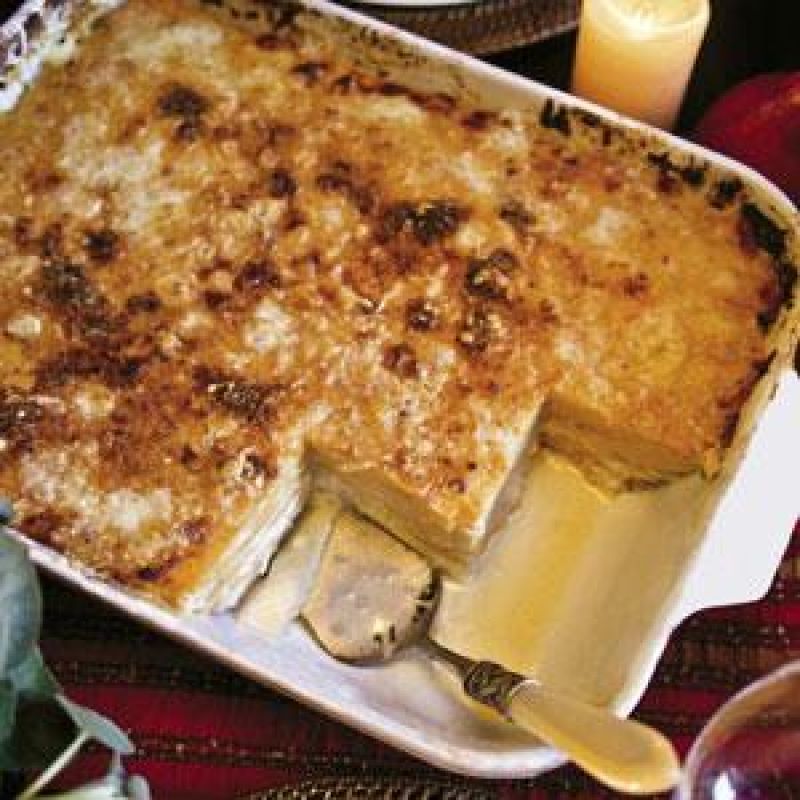 Spread a bit of the cream on the bottom of the casserole dish. Place a layer of rutabagas, sweet potatoes, and Russet potatoes on top. Follow with cream and cheese. Continue layering, ending with a layer of cheese.